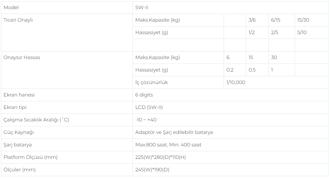 6,15, 30 kg kapasite seçenekleri ile istenilen ağırlıkta tartım hassasiyeti, 300 saat akü veya pilli kullanım seçeneği.