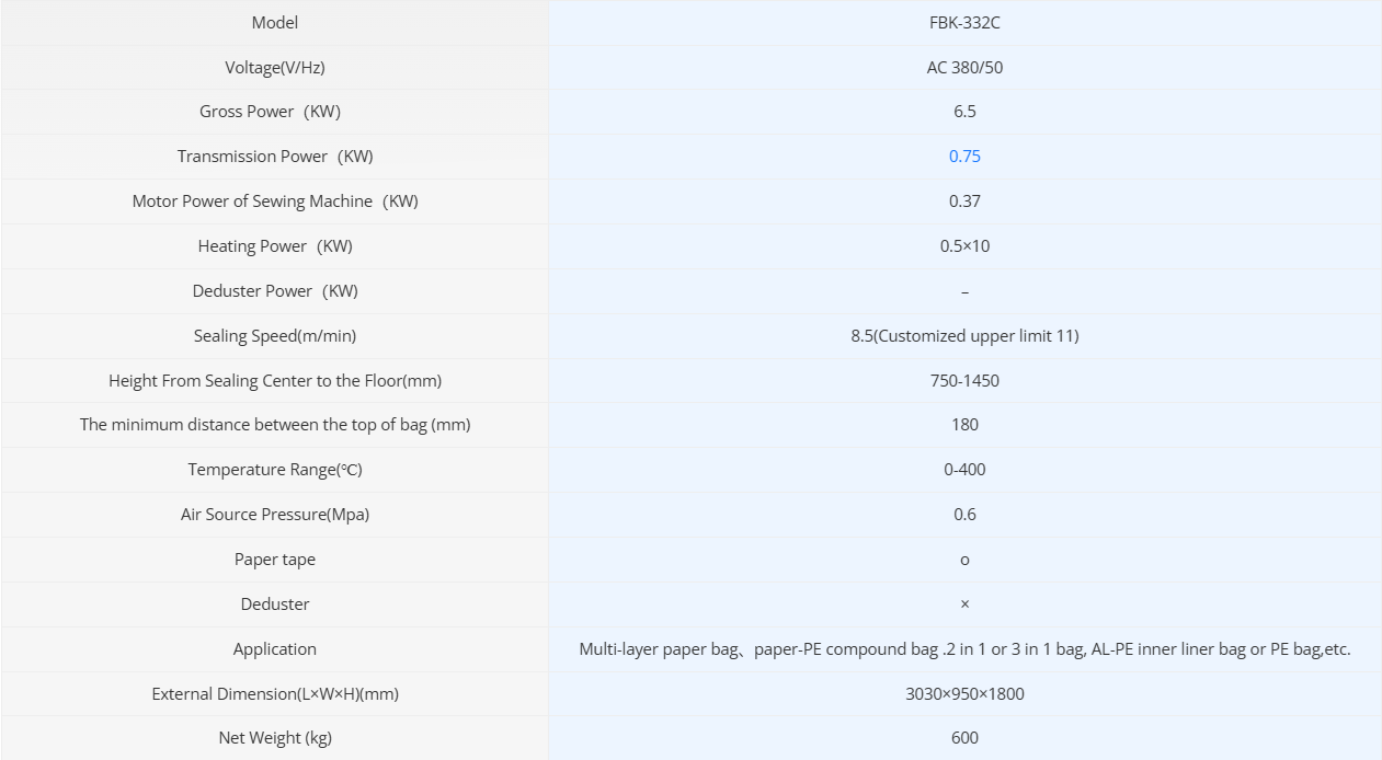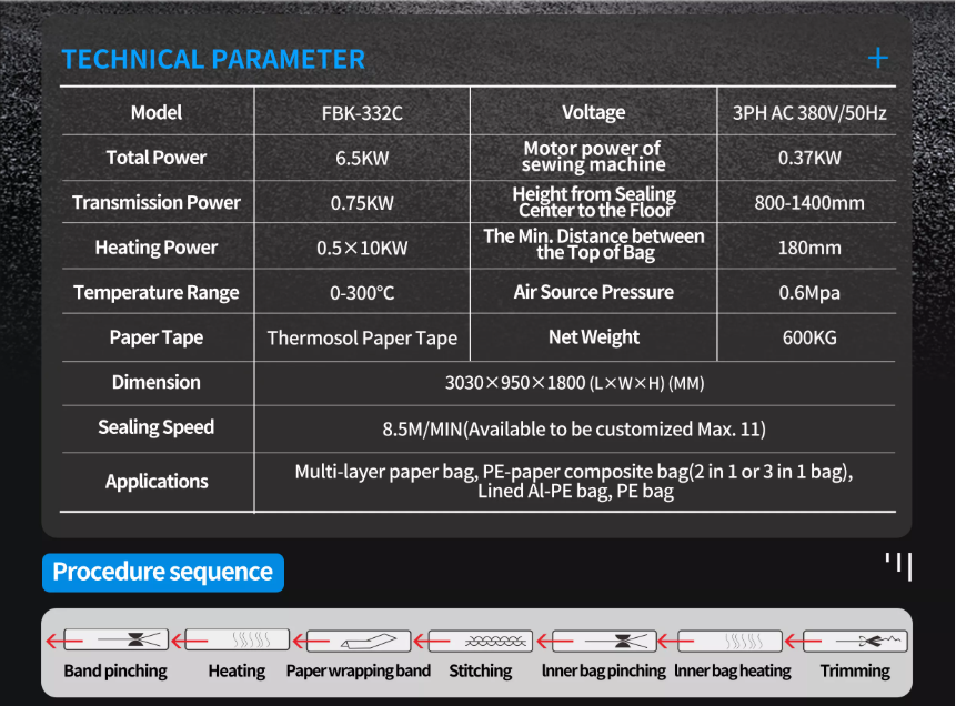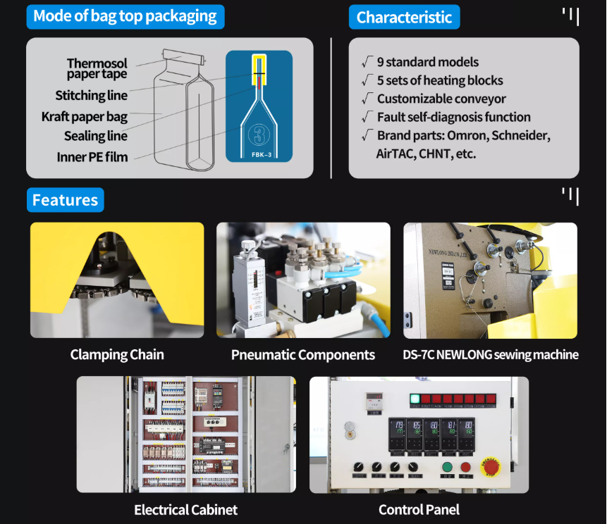 FBK serisi otomatik dikiş ve mühürleme paketleme makinesi, ağır hizmet tipi torbalar için uygundur; tek katmanlı Kraft kağıdı, çok katmanlı Kraft kağıdı ve kağıt/plastik lamine torbaların paketlenmesi için idealdir.